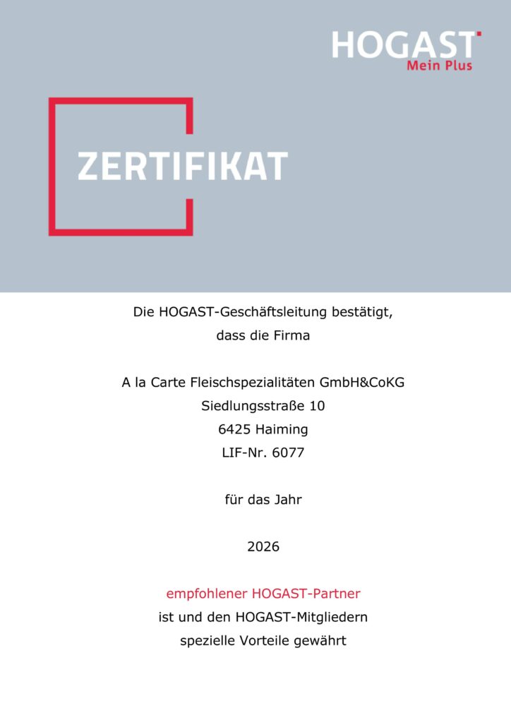 Die à la Carte Fleischspezialitäten GmbH wurde 1996 von Günter Höpperger gegründet, der das Unternehmen auch heute noch mit seiner langjährigen Erfahrung in Führungspositionen der Fleischspezialitätenbranche als geschäftsführender Gesellschafter führt. Durch die EU-Zulassung mit der Nummer AT70318EG ist es möglich auch Spezialitäten aus der Europäischen Union zu beziehen.